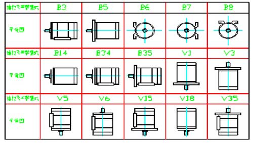 YBX4防爆電機的安裝方式符合GB997《電機結構及安裝型式代號》及IEC34-7 的規定。本系列電動機有以下5 種基本結構型式:B3—機座帶底腳、端蓋無凸緣;B5—機座不帶底腳、端蓋有凸緣;B35—機座帶底腳、端蓋有凸緣;B14—機座不帶底腳、端蓋有小凸緣;B34—機座帶底腳、端蓋有小凸緣。本系列電動機在上述5 種基本結構上,可派生15 種常用結構及安裝型式見下表: